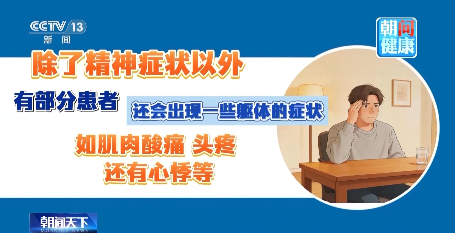 除了这些精神症状以外,有部分患者还会出现一些躯体的症状,如肌肉的酸痛、头疼,还有心悸等。