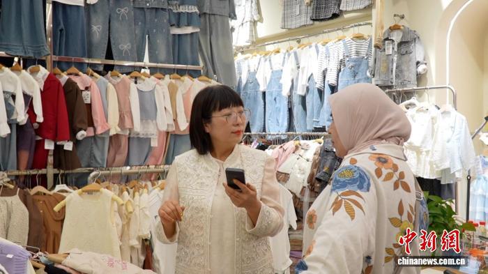 “刚才给你看的那件童装就是特价处理的,现在优惠很多。”文晓莉拿起一款童装说。话音刚落,她手中的翻译器立刻将其翻译成乌兹别克斯坦语播报出来。经过三个多小时精心选品,两位客商成功下单数百件童装。