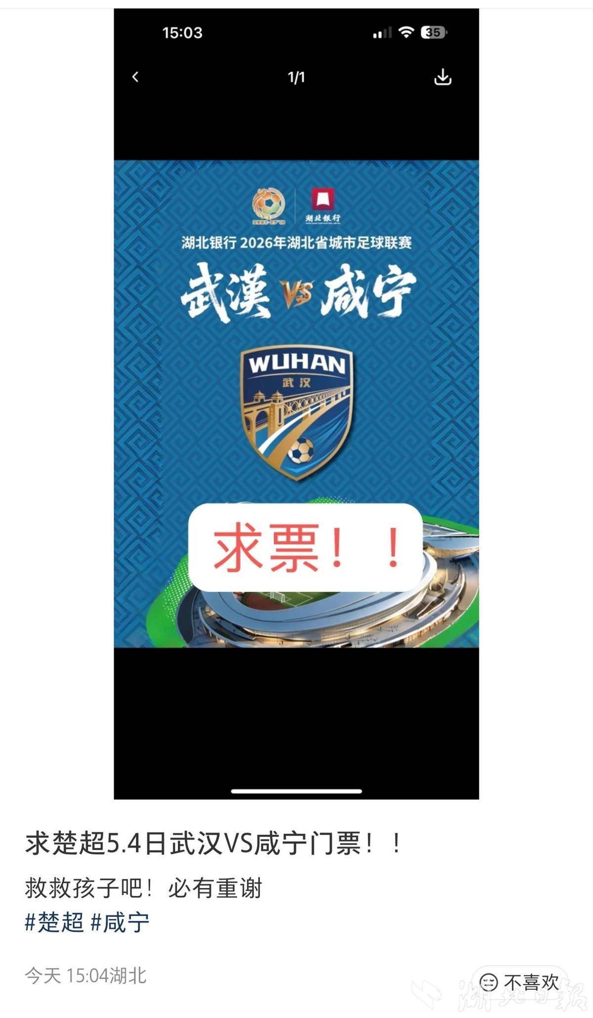 因此,5月4日这场比赛的含金量已不言而喻。此次主场比赛场地武汉五环体育中心曾经承办过军运会、中超联赛等顶级赛事,首轮开票不到20分钟,万余张球票被一扫而空;此后主办方分批次加推余票,每次放票几乎都是“秒空”节奏。点开社媒平台,求票帖从放票首日排到了现在,催票声一浪高过一浪。
