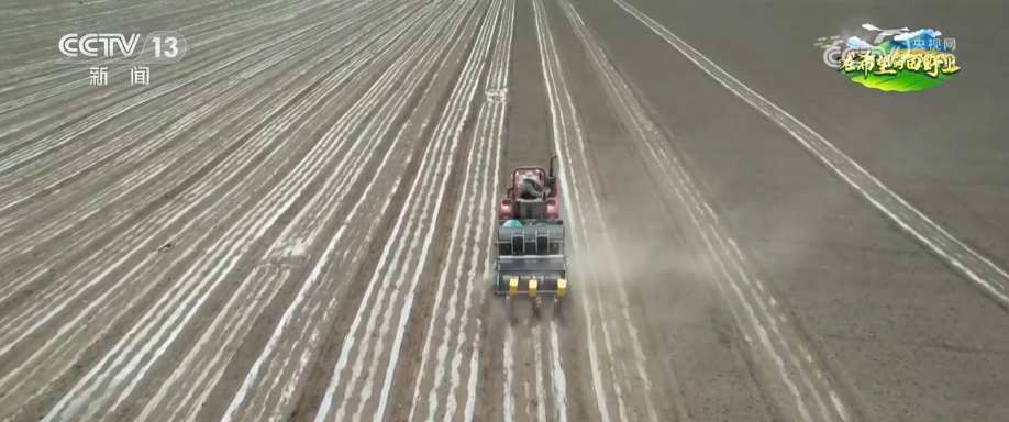 当农机在北斗卫星导航系统指引下驶过田地,种子被种到地里的同时,铺管装置会开出小沟,将滴灌带平稳地铺设在预定位置。一层地膜也被均匀铺开,起到减少水分蒸发等作用。
