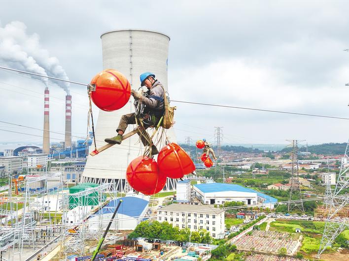 4月24日,鄂州电厂220千伏线路改造现场,电力工人在60米高空地线与光缆上安装航空标识球。