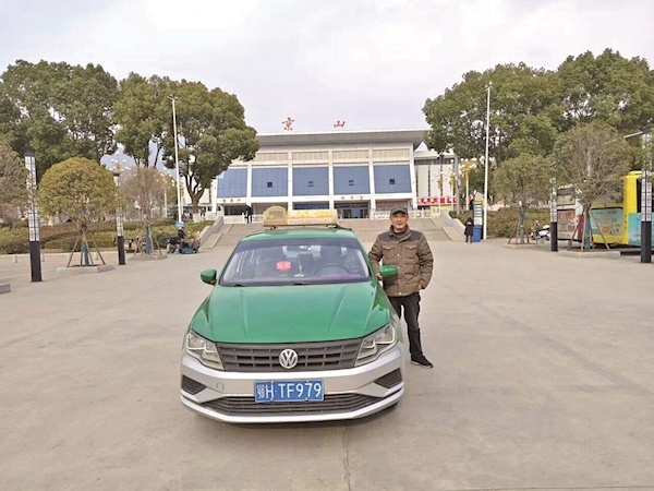 袁军波和他驾驶的鄂HTF979出租车 通讯员供图