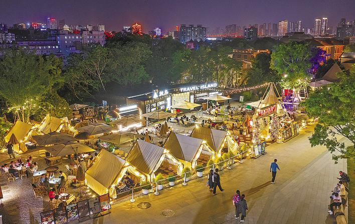 4月25日晚,许多游客踱步到达武汉昙华林凤凰山山顶时,发现这里有一场小型音乐会,在此可吹山风、听歌、吃烧烤,还能以黄鹤楼和龟山电视塔为背景拍一张纪念照,感觉很惬意。(湖北日报全媒记者 朱熙勇 摄)