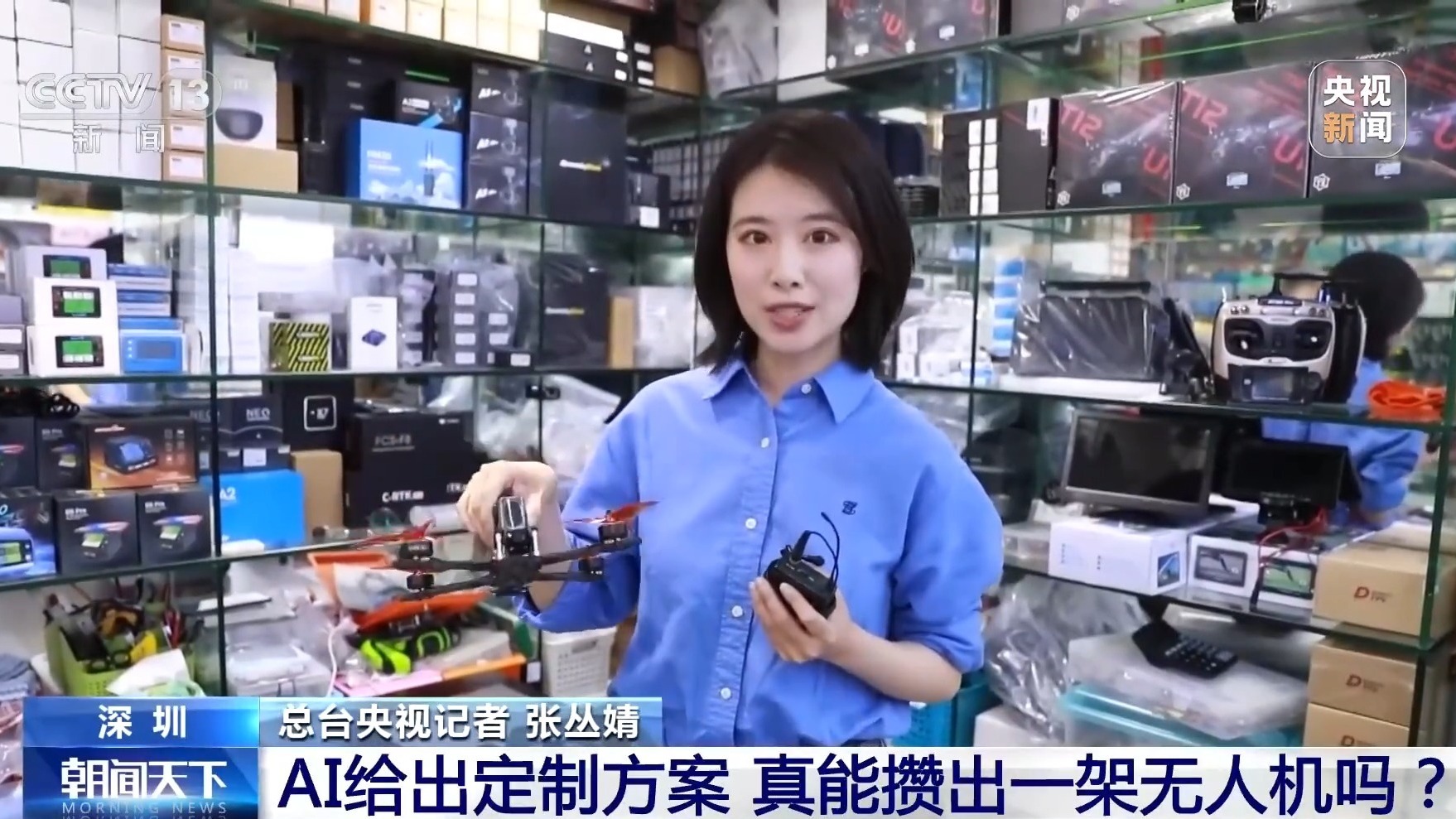 总台央视记者 张丛婧:这就是我们刚刚组装出的一架无人机,所有配件都是在这个楼里买到的,从一堆零散配件到这样的整机,只用了不到两个小时的时间。现在我们就来试一下它的功能到底如何,看它能不能飞起来。