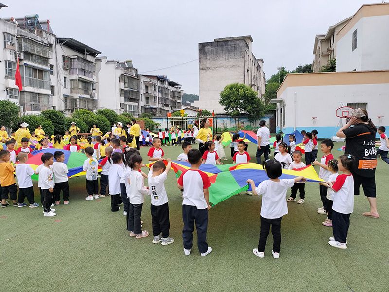捐赠仪式后,两所幼儿园的儿童开展了手拉手、交朋友、送爱心庆六一活动。孩子们随着老师的口令有节奏地抖动着彩虹伞,为自己的节日制作“彩虹蛋糕”;在一阵阵振奋人心的击鼓声中,默契的传球;在十米画卷中,孩子们以画传情,感谢远道而来的客人对他们的关爱,亲手为小伙伴们送上自己精心准备的礼物,搭建友谊桥梁。