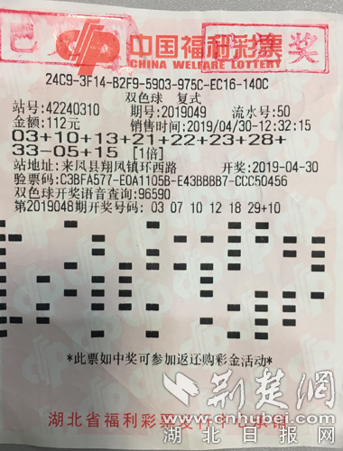 荆楚网客户端—荆楚网消息(通讯员 潘岭 李建民)4月30日,福彩双色球第19049期开出03、10、13、22、23、28+15的大奖号,湖北恩施来凤一彩民,凭借一张8+2的复式票,斩获头奖一注、二等奖一注,收获奖金667万元。
