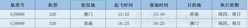 恩施—澳门航线每周四、周日各开通一班,由浙江长龙航空公司大型舒适客机执飞,16:25从恩施机场起飞,经过2个小时的飞行,18:25抵达澳门国际机场。