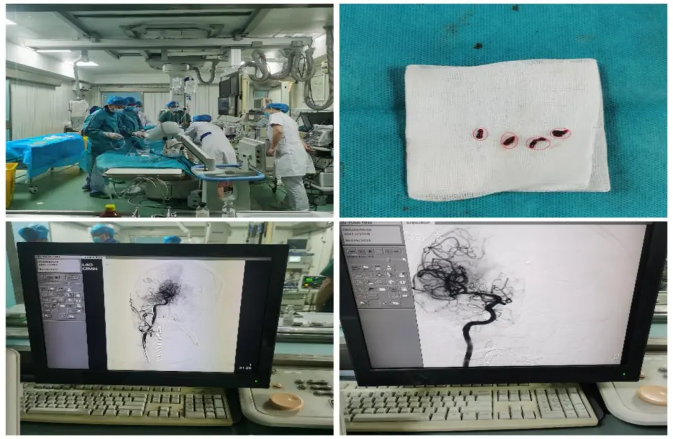 下午3点半,股动脉穿刺成功,45分钟后血管部分再通,65后右侧大脑血流灌注完全恢复,术中取出4个血栓。术后1小时,患者意识清楚,左侧肢体肌力完全恢复。该病例“出人意料”的疗效充分诠释了“时间就是大脑”,是神经内科介入团队辛勤努力的回报,也是整个卒中中心各部门——神内、心内、影像、麻醉等科室通力合作的结果。