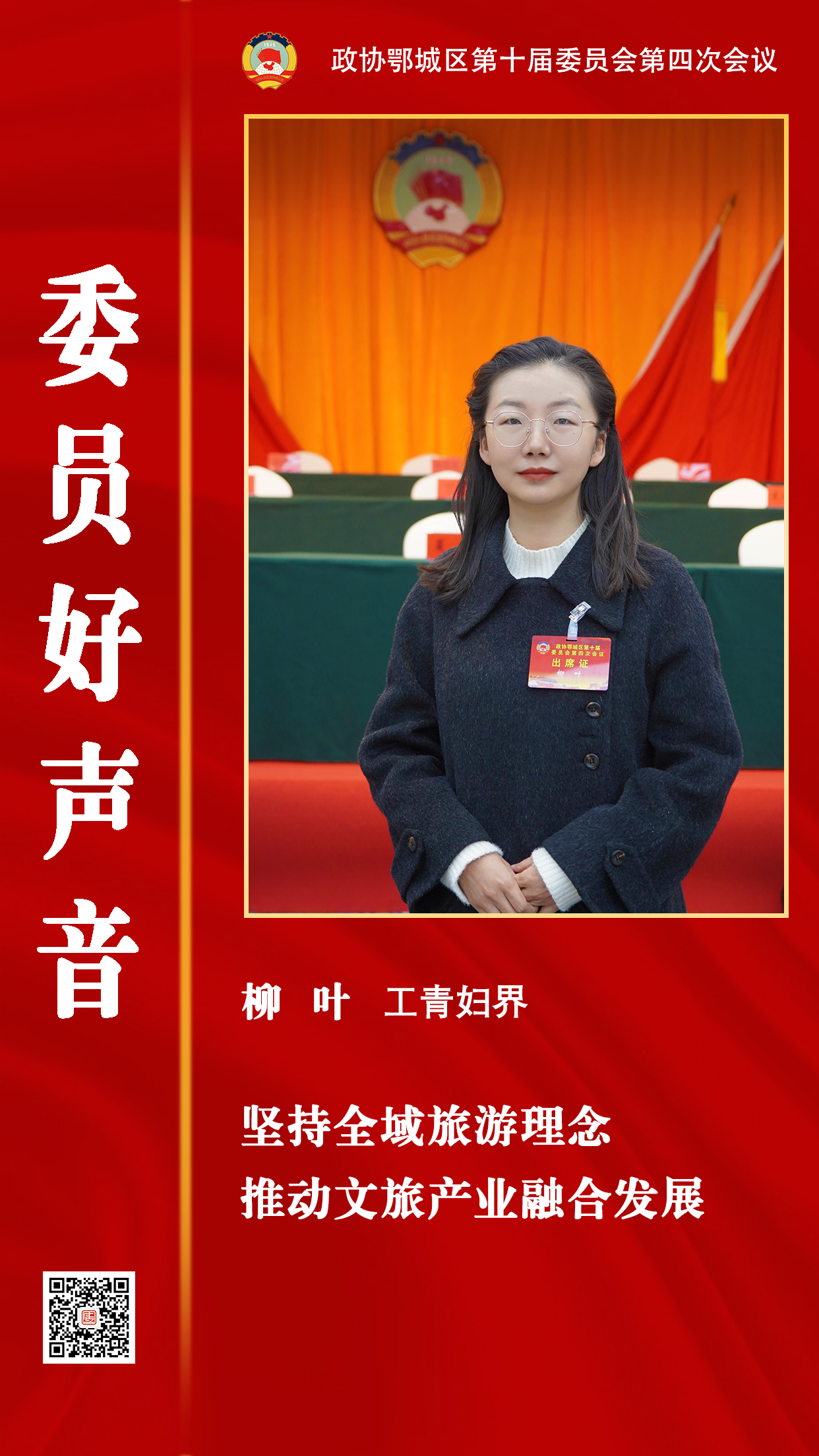 12月28日,在中国人民政治协商会议鄂城区第十届委员会第四次会议上,来自工青妇界的政协委员柳叶建议,健全完善旅游规划体系、协同打造特色文旅品牌、加强旅游基础设施建设、构建文旅宣传营销体系、健全旅游投诉处理机制等,推动文旅产业融合发展。