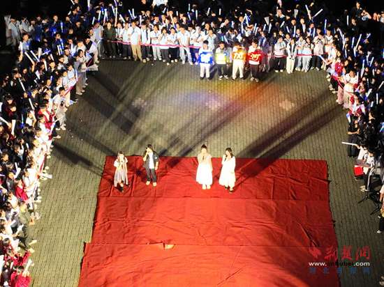 夜幕降临,伴随着校歌《青春的诗章》的旋律,在高三教学楼前广场,学生们手持荧光棒,整个学校汇成一片欢乐的海洋。灯光与荧光棒交相辉映,现场气氛热烈。《就是哪吒》以高亢的嗓音和传统乐器唢呐声震撼开场,紧接着《裹着心的光》《火力全开》等歌曲轮番上阵,穿插着街舞、扇舞、剑舞等多种表演形式,将传统与现代完美融合,瞬间点燃了现场的激情。
