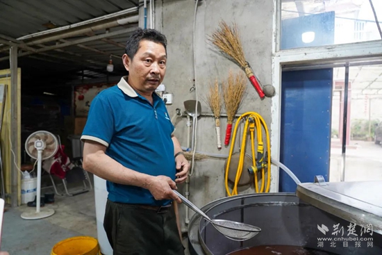荆楚网(湖北日报网)讯(记者陶辉 通讯员 廖剑云、卢金云)5月13日凌晨4点,庙岭镇大叶村还笼罩在夜色中。59岁的谢世华推开新叶家窑酿酒作坊的木门,铁锅内的高粱正翻滚蒸煮。他手握包浆的木柄铁铲匀速翻动,蒸腾的雾气在睫毛凝成白霜——这是酿酒师谢世华雷打不动的开工时刻。