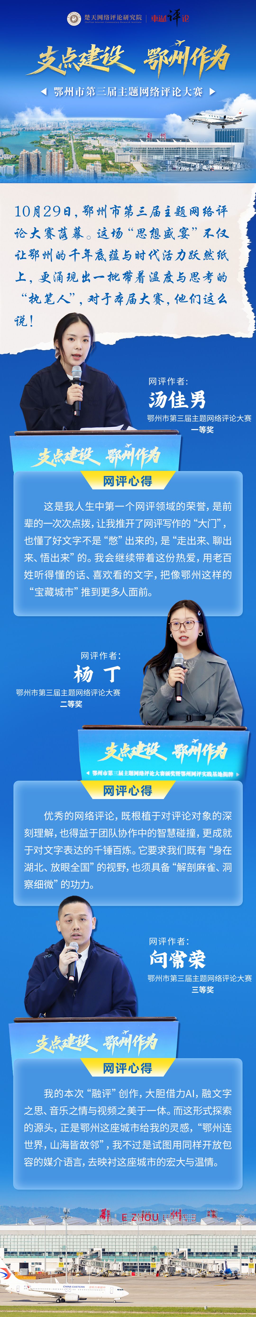 荆楚网(湖北日报网)讯(记者 刘璐 刘浩 通讯员 陈稳定)10月29日,鄂州市第三届主题网络评论大赛颁奖仪式举行,来自各地的网评作者代表齐聚千年吴都,3名获奖嘉宾现场分享创作心得,共话鄂州发展。