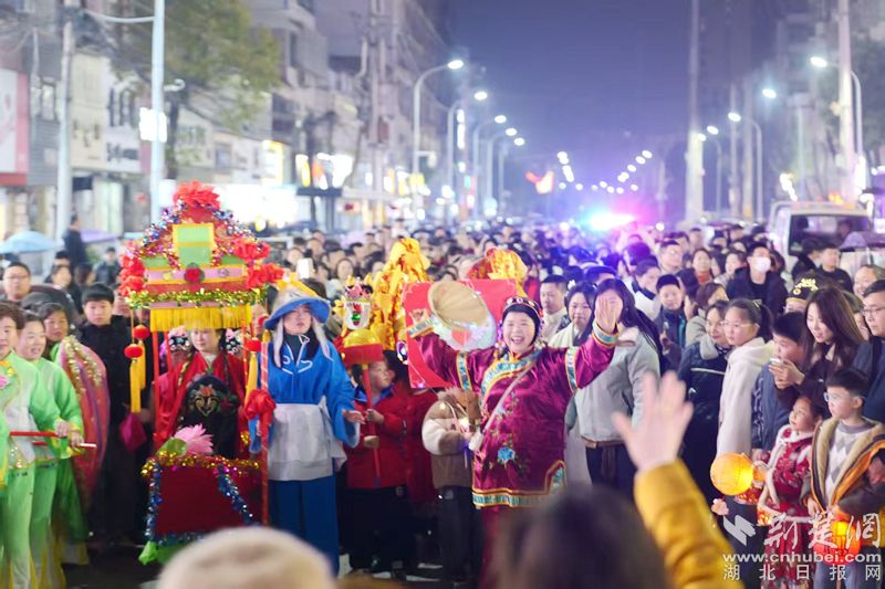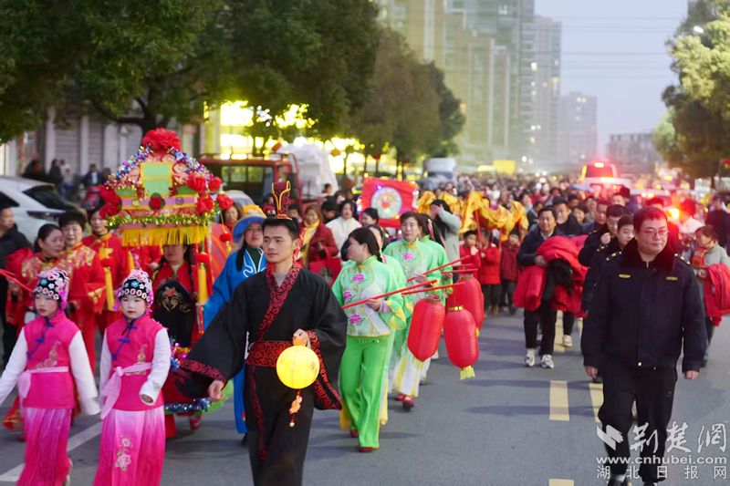 晚6点半,巡游队伍行集结完毕。7个方阵中,既有非遗牌子锣、采莲船,也有实验学校师生、童心桥小记者、新就业群体,所到之处,沿街商户和居民纷纷探窗、驻足。有黄石网友现场直播,弹幕飘过:“这是鄂州花湖?我以为穿越了。”