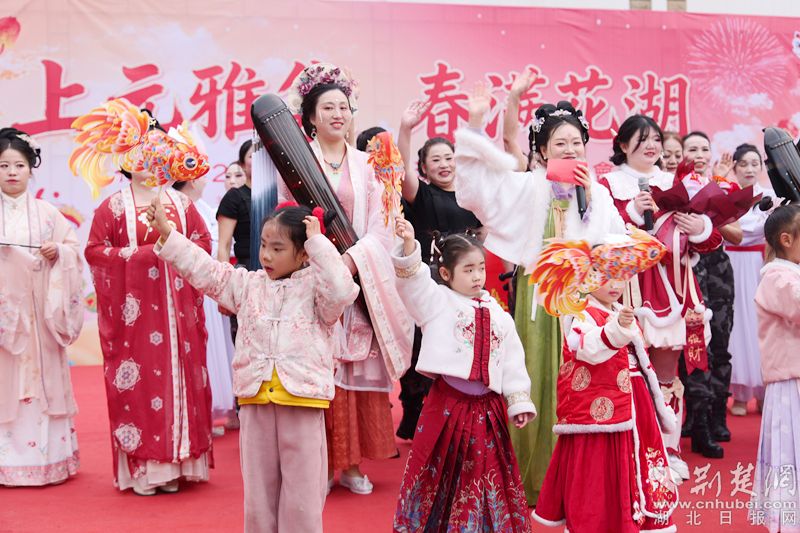 “往年元宵,我们黄石人一般就在市内转转。今年听说花湖有汉服巡游,专门带孩子过来。”家住黄石港区的李女士举着手机,追着采莲船拍了十几条视频。她的儿子穿着一身红色汉服,正和刚结识的鄂州小朋友比谁手里的兔子灯更亮。