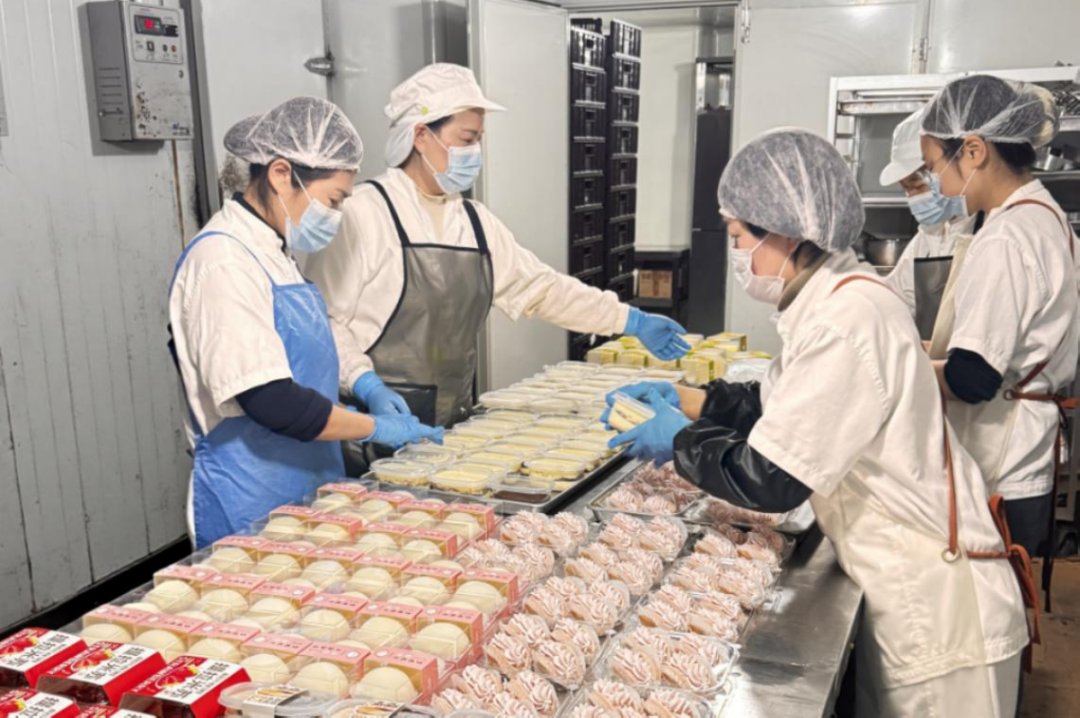 新时代鲜奶蛋糕店生产操作间内,工作人员正在忙碌的完成点心包装,流水线作业井然有序。彭德森 摄