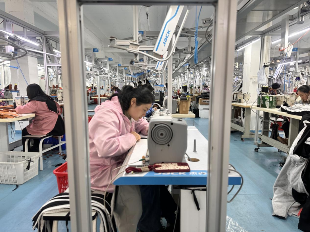 辉辉服装厂车间里缝纫机声此起彼伏,工人们指尖翻飞赶制订单。徐佳雨 摄