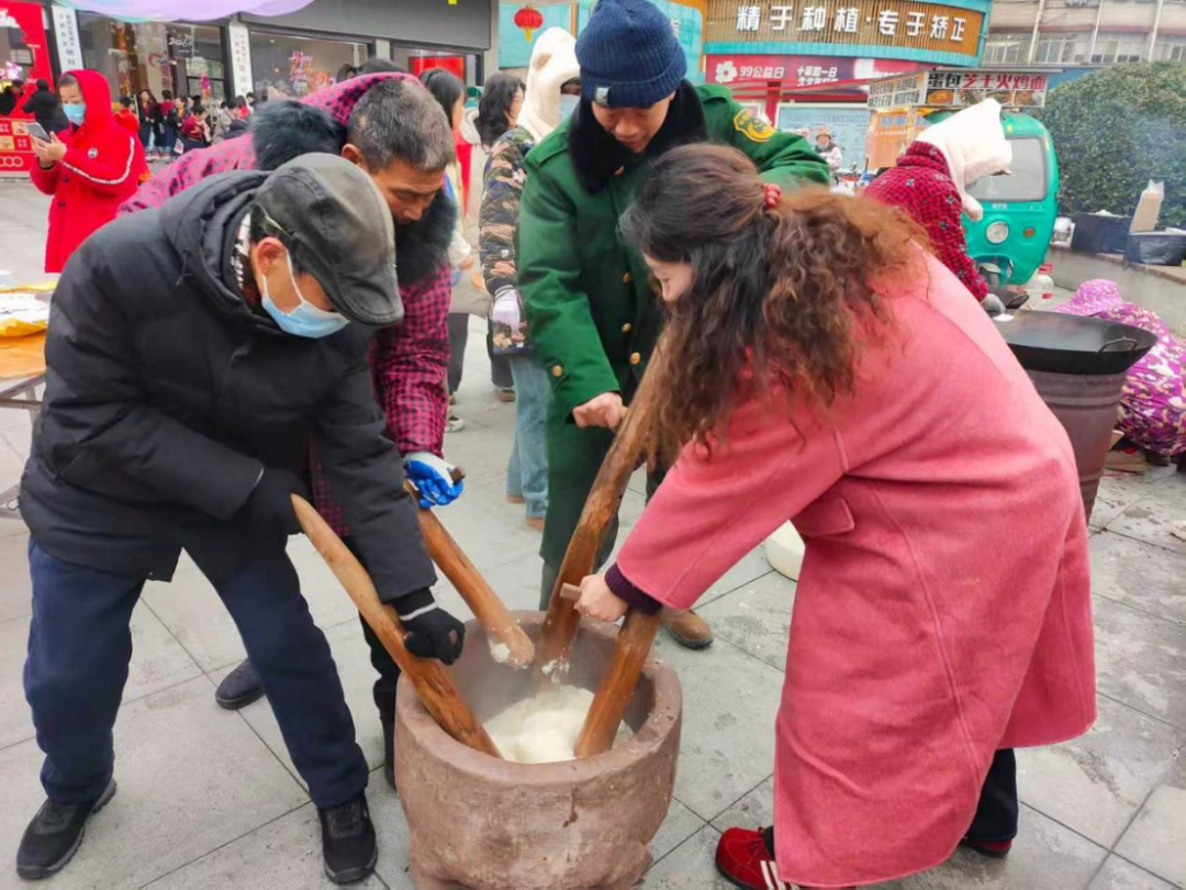 镜园社区在门前广场隆重举办我们的节日·春节“镜园纳福迎金马 睦邻相聚庆新春”第六届邻里节活动,现场大家一起打糍粑。詹柯 摄