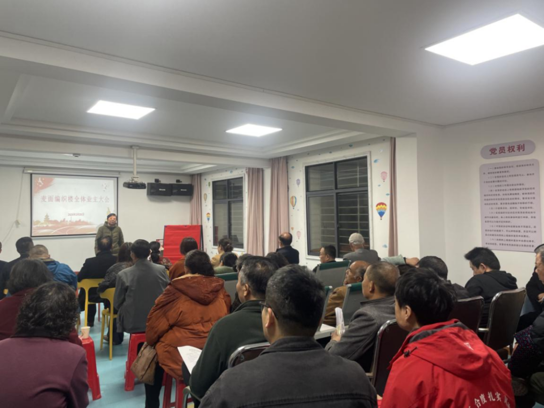 北门社区受业主委托牵头召开麦面编织楼危旧房自主更新改造项目全体业主大会,会上业主就是否自主更新有关事项进行表决投票。周聪 摄