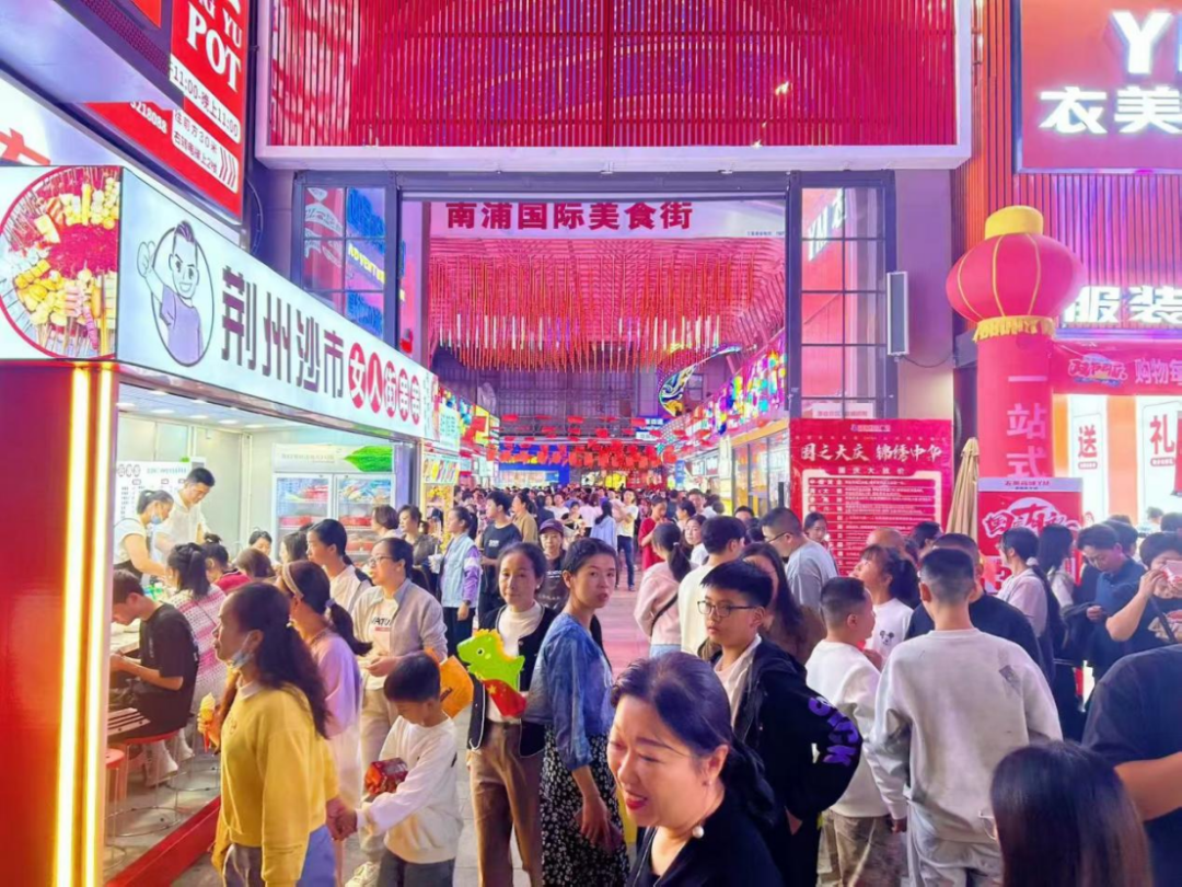南浦国际美食街人潮涌动,各类美食小吃店门口排起长队,消费人气爆棚,烟火气十足。朱飞 摄