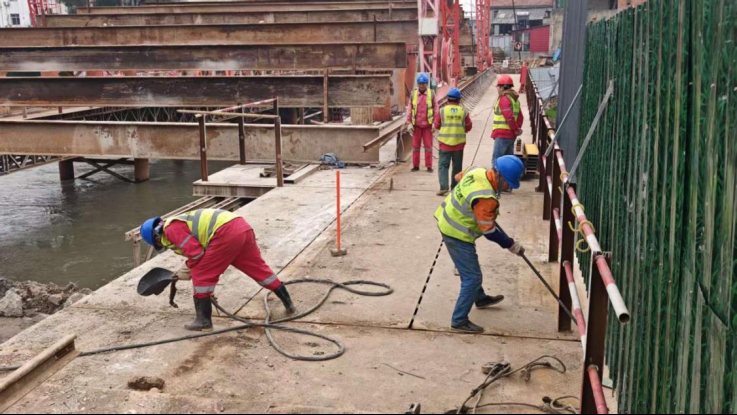 长港大桥消危加固工程进入承台施工新阶段,工人们正紧张有序进行钢筋绑扎与模板安装,全力保障桥梁安全与通行能力提升。朱振宇 摄