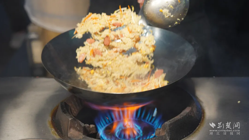 这里是鄂州人的记忆老街,更是年轻人的创业沃土。在这片热闹的烟火里,“会跳舞的饭”摊位前始终围着不少食客,摊主龚巨民,这个1997年出生的江西上饶小伙,熟练地颠着勺,浑身透着蓬勃朝气,锅里的炒饭滋滋作响,香气顺着晚风漫满整个街巷。