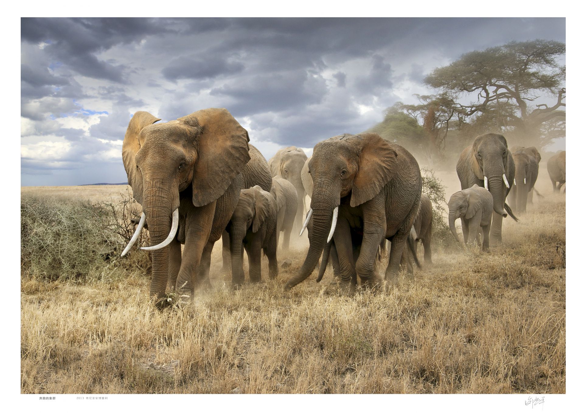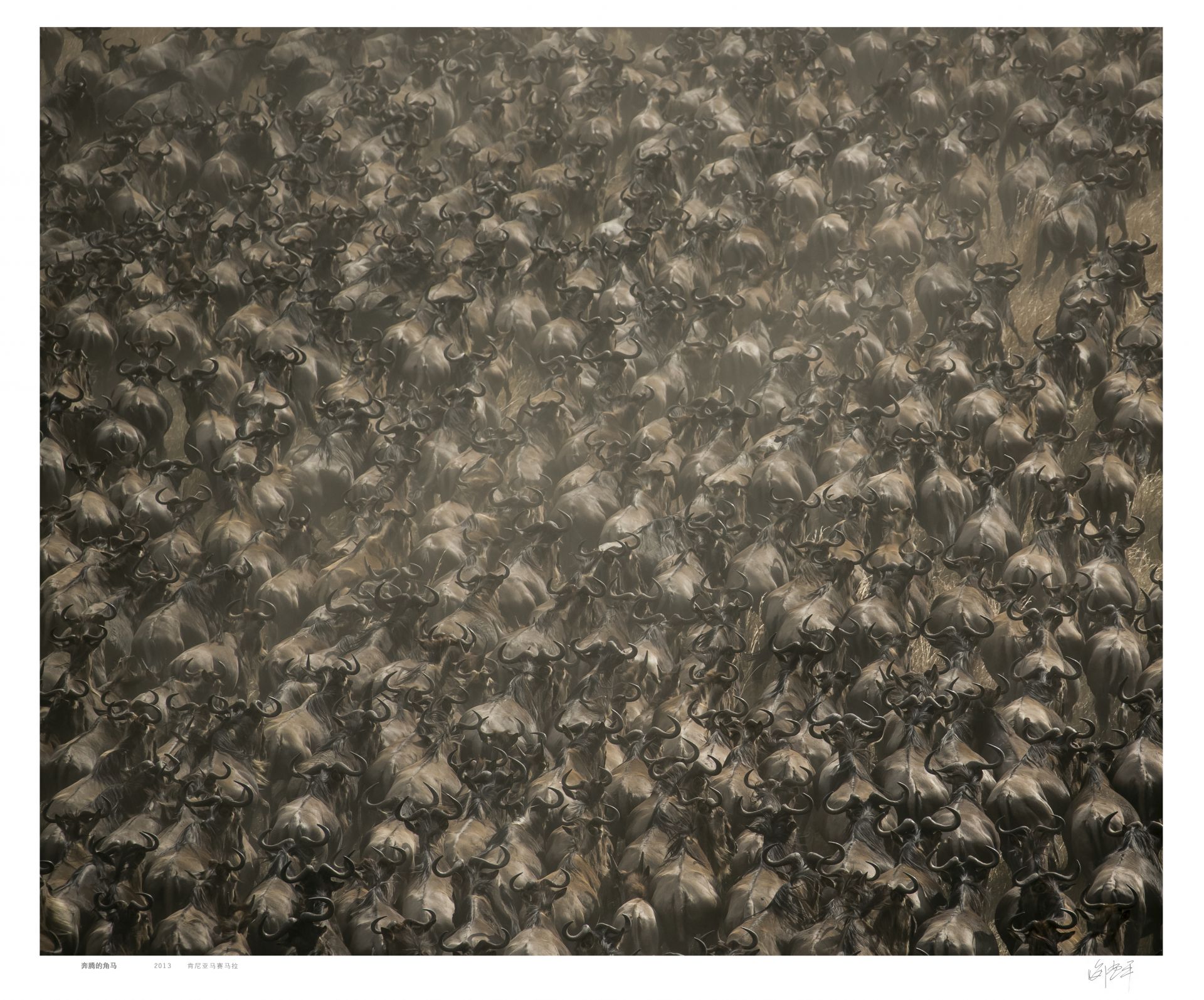 旱季,大群角马在迁徒中穿越马赛马拉自然保护区。它们所到之处,草被吃光,奔跑时尘土飞扬,好不壮观。我乘座的直升机刚升空2分钟,发现远处黄色的草原上一片黑色伴随着飞扬的尘土在快速移动,立即飞往上空,用300mm焦距镜头拉近角马群,用满构图的方式,让奔腾的动物有冲出画面之感,在快速的运动中拍下这一瞬间。