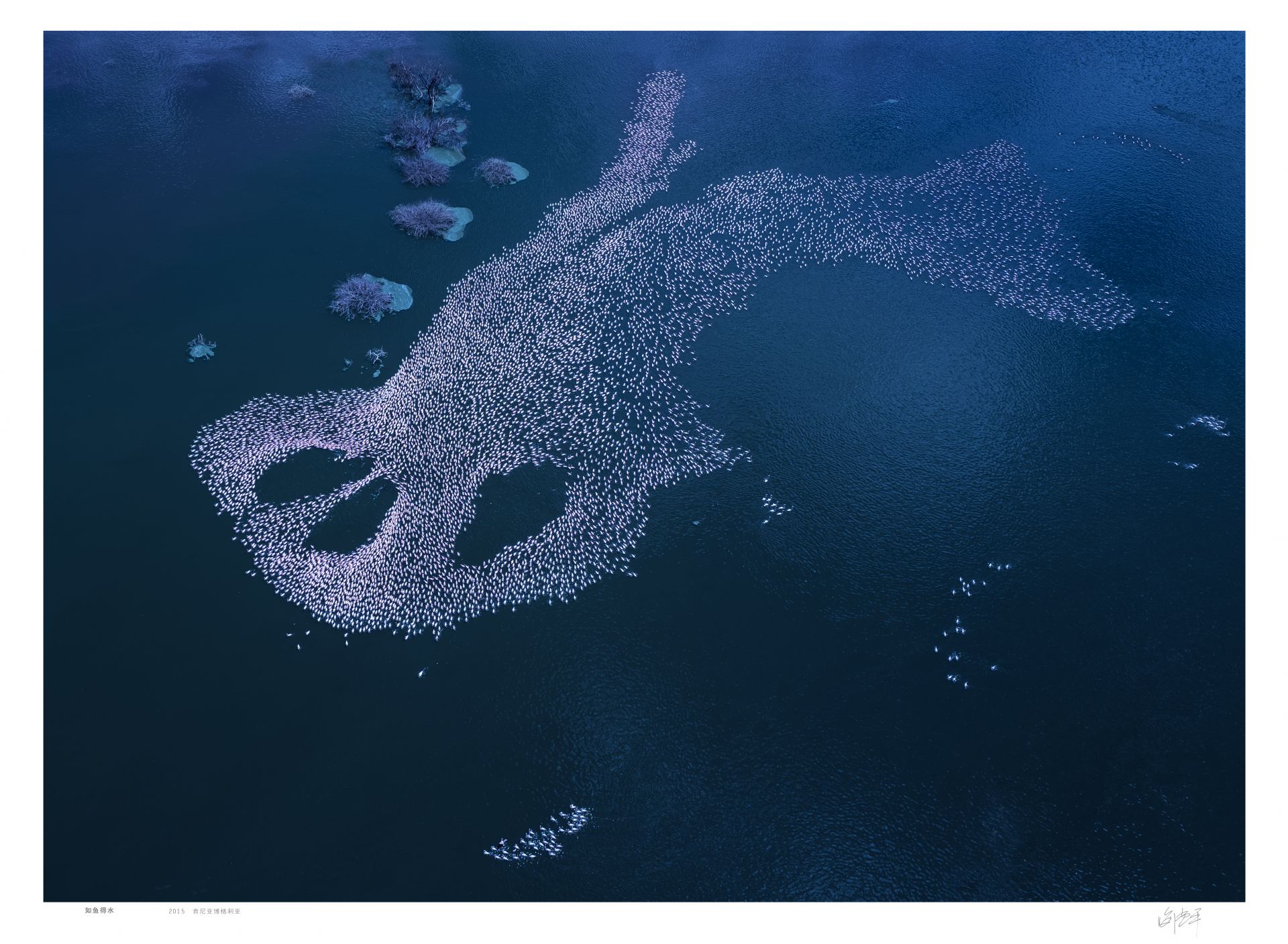 数以百万计的火烈鸟栖息在博格利亚湖,他们随地形聚集在一起,被我拍摄到这幅类似人类面具的画面。面具:数以万计的火烈鸟栖息在博格利亚湖,这里是他们家园,他们聚集在一起形成了类似面具的形状,好像无意识中在抵制外来入侵破坏他们似天堂的家园。