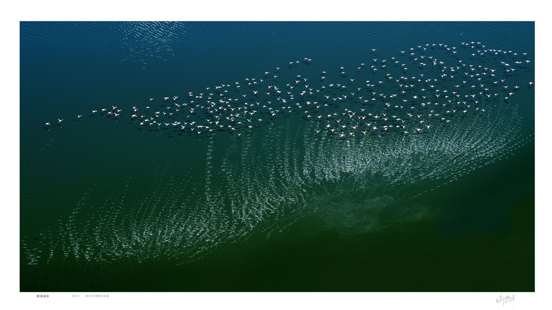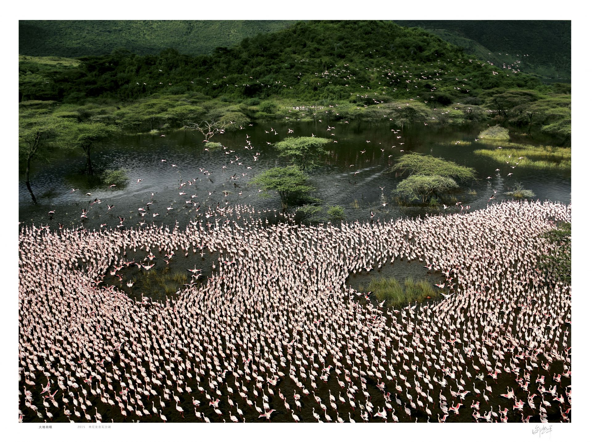 博格利亚湖吸引着成千上万只火烈鸟在这里生息,它们随湖面地形自由游走觅食,形成一只大鲸鱼图形。