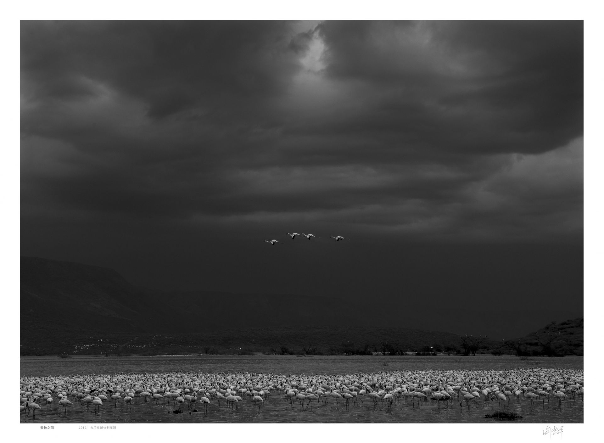 火烈鸟在博格利亚湖面上飞行, 我乘坐的直升机越过它们的时候,恍若一场梦境,彷佛我也变成了一只鸟遨游在漫天繁星中。