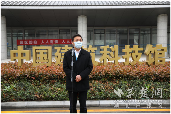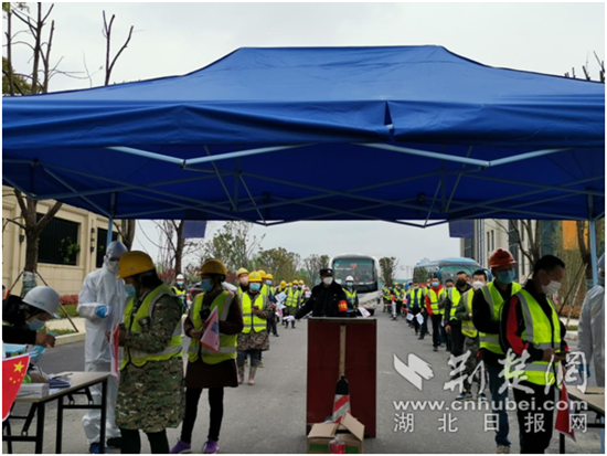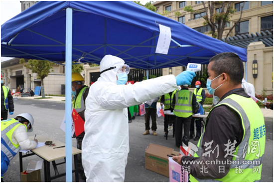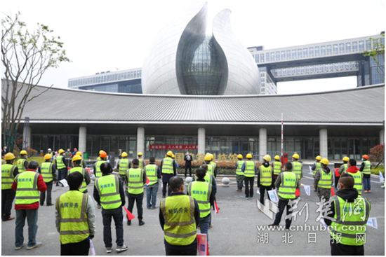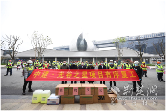 荆楚网客户端—荆楚网消息(通讯员淳立基、张驰越)3月30日上午,中建科技产业园(中建•光谷之星)在园区中国建筑科技馆北广场迎接首批返岗工人,并为工人送上防疫物资,按下复工“启动”键。