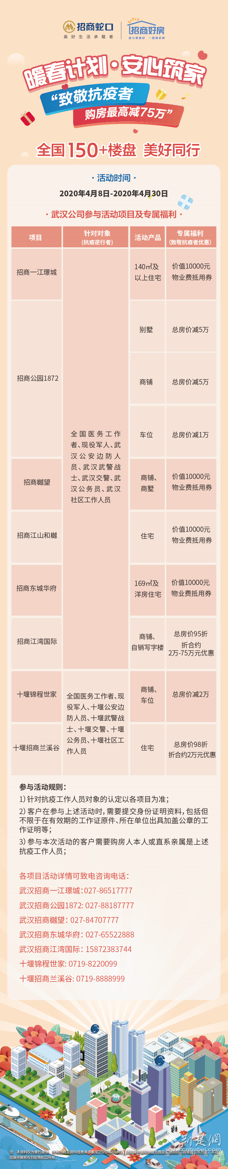 在这个特殊的日子,招商蛇口为一线抗疫人员奉上一份特殊的谢礼:4月8日至4月30日,招商蛇口推出“暖春计划 安心筑家”活动,全国150多个楼盘,以专属权益为一线抗疫者致以最诚挚敬意。