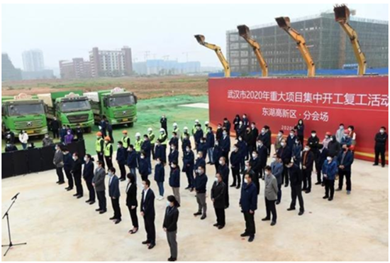 4月10日,武汉市在“解封”后,首次举行重大项目集中开工复工活动。在东湖高新区分会场,14个项目集中开工,总投资额约138.9亿元。