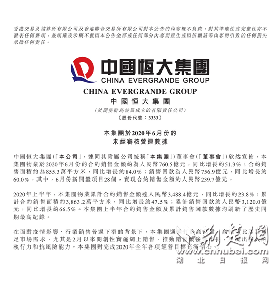 7月1日,恒大晒出了2020年上半年业绩成绩单,截至6月末,恒大年内已实现销售额3488.4亿,销售面积3863.2万平,分别同比大增23.8%及47.5%;累计销售回款3120亿,同比增66.5%,以上指标均创下公司同期历史新高。