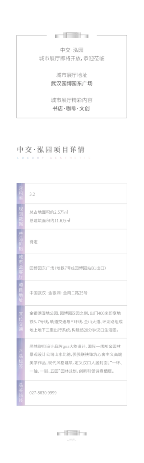 中交地产武汉公司的发言人表示,中交·泓园的打造,将以“心奢主义”为产品理念,营造一种自然、自由、轻盈的游逸于城心的美学生活,为武汉带来一种简洁、舒适而又不忽略细节的低调奢华生活方式。
