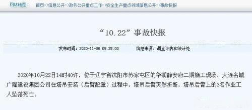 2020年10月22日14时40许,位于辽宁省沈阳市苏家屯区的华润静安府二期施工现场,大连名城广隆建设集团公司在塔吊安装(后臂配重)过程中,塔吊后臂突然折断,塔吊后臂上的3名作业工人坠落死亡。