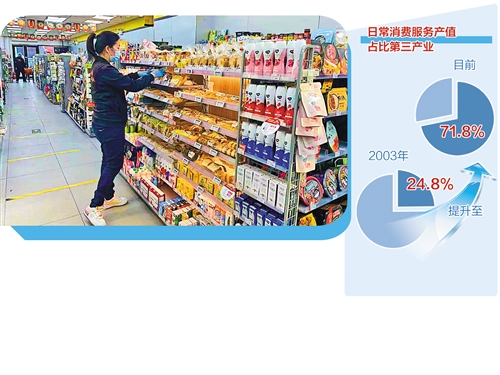 社区商业正迎来快速发展的机遇期。中国连锁经营协会、浙商证券股份有限公司联合发布《时代性大趋势系列:本地生活服务连锁研究》显示,我国第三产业增长迅速,日常消费是占比最大、最具潜力的赛道,而日常消费服务产值从2003年占比第三产业的24.8%提升至71.8%,是第三产业的主要门类。