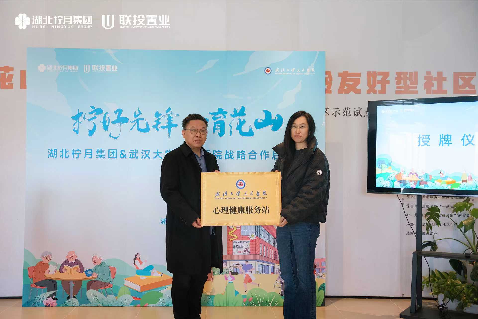 武汉大学人民医院对外联络部副部长程博与湖北柠月集团副总经理庞颖共同签订《心理健康服务战略合作协议》,武汉大学人民医院主任医师、副教授陈振华为“武汉大学人民医院心理健康服务站”授牌,标志着专业心理健康服务正式进驻社区;同步发布心理健康咨询热线027-65527588,居民在家门口就能获取专业的心理支持。