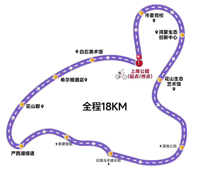 本次骑行路线以花山河上岸公园为起终点,全长约18公里。途经鸿蒙生态创新中心,骑友们感受到的是科技与创新赋予城市的澎湃动能;在花山生态艺术馆附近,建筑的艺术感与环境的静谧相得益彰;进入严西湖绿道段,湖风拂面,水鸟翩跹,开阔的湖景则是对湖北联投坚持生态优先、绿色发展,累计完成超千亿投资进行生态修复与绿色建设的最佳注解。这条路线,让参与者在有氧运动中,深度阅读了花山作为“新型城镇化湖北样本”的规划之美、产业之新与生态之优。