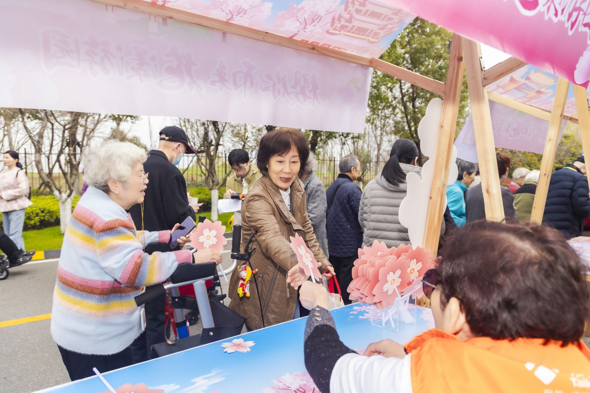 游园区内,樱花主题打卡点诗意盎然,樱花手工、祈福签、特色美食、拍立得留念等体验摊位人气高涨。红焰社区长者与楚园居民携手参与、同乐互动,在交流互动中拉近邻里距离,凝聚社区温情。此次活动打破机构与社区的边界,以文化活动为纽带,让养老服务更有温度、更具活力。