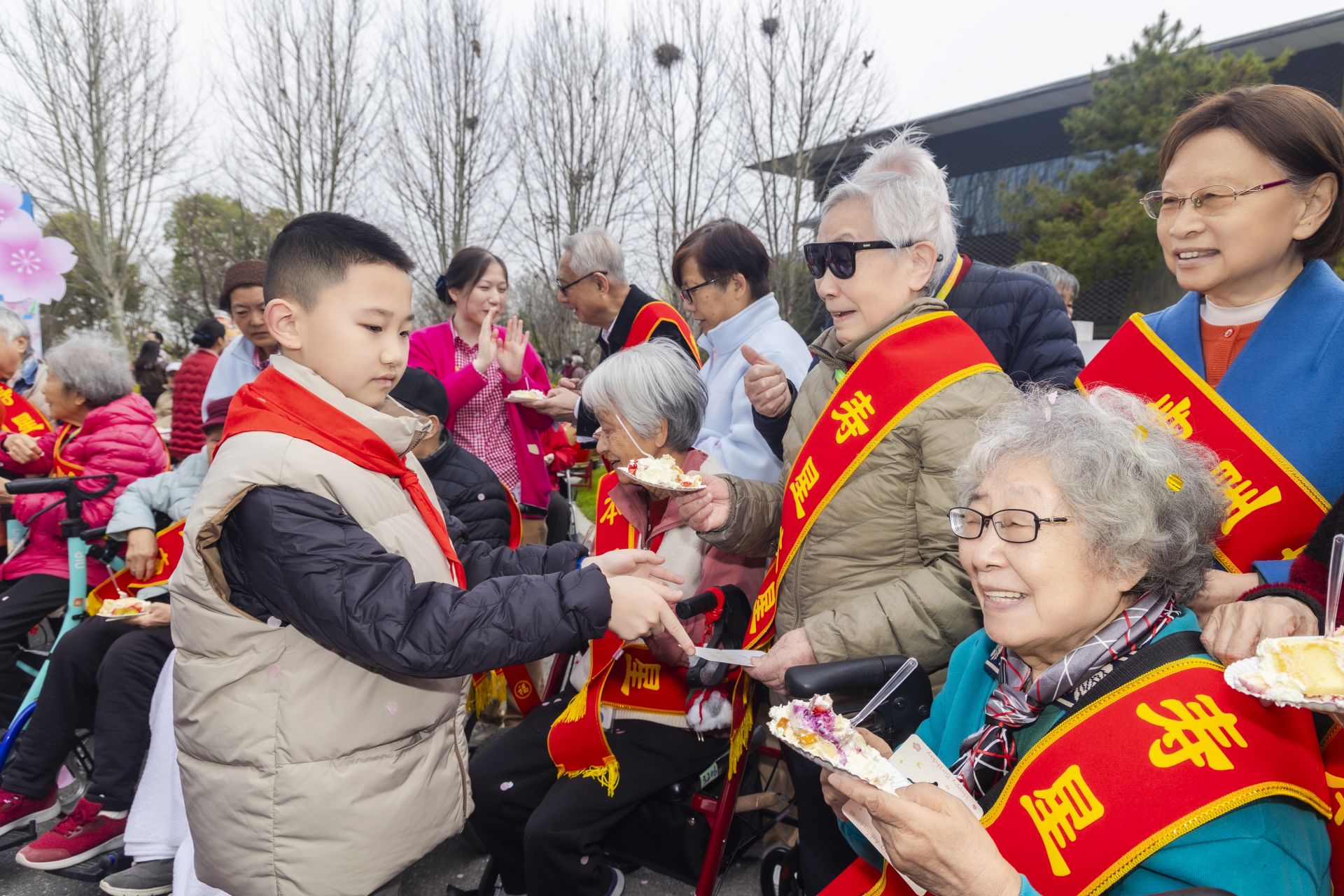活动在激昂欢快的花样鼓表演《苍穹唤》中拉开序幕。长者们身着盛装,带来三十二式太极剑展演,动作舒展、气韵生动,尽显从容气度与生命活力。由园区长辈化身的 “十二花神” 依次亮相,以花为题、以诗传情,成为现场最动人的风景。孩子们为花神送上亲手制作的礼物,一老一小温情互动,传递着文化传承与代际温暖。活动现场还为三月生辰的长辈举办集体生日会,歌声、祝福声与欢声笑语交织,定格温馨瞬间。