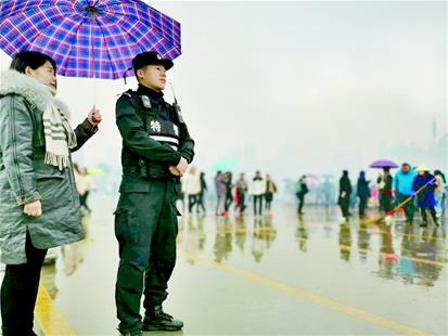 汪瑞说,当时自己并不怪妻子,毕竟她刚生完小孩不久,容易焦虑。这段小插曲并没有影响二人的感情,随着孩子的长大,小两口日子过得有滋有味。眼看农历猪年就要来了,朱敏和孩子先回了六安娘家和亲人团聚;腊月二十九汪瑞在单位值夜班,腊月三十上午7时,他坐了两个小时火车赶回老家吃年饭,到了晚上8时匆匆返程,投入到紧张的春节安保工作中。“我没想到,她会赶到我执勤岗上来看我,”谈到今年大年初五的团聚,汪瑞脸上露出了笑容。他说,后来得知这次“突然袭击”是朱敏酝酿已久的,妻子想给他一个惊喜。那天一大早,朱敏开车上了高速公路,因为下雨,近400公里的路程开了6个小时。当她来到归元寺财神殿门口时,看到汪瑞警容严整地站在人群中,正手持扩音器大声疏导人群,朱敏的眼睛不由得湿润了。她默默撑开了伞站在了丈夫身后,为他遮挡从天而降的冻雨。