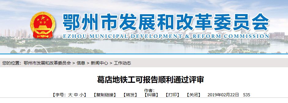 2月19-21日,省发改委委托中国国际工程咨询有限公司在武汉召开葛店地铁工程可行性研究报告评估会,并顺利通过专家审查。这是葛店地铁获国家发改委正式批复(发改基础[2018]1915号)后的又一重大进展。