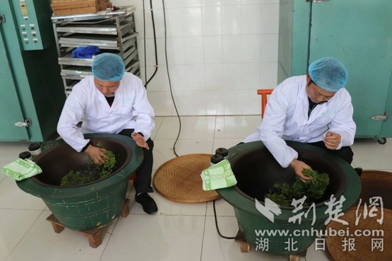荆楚网客户端—荆楚网消息(通讯员王登府、刘毅)“这杯茶喝起来感觉很好!“品鉴了现场炒制的第一杯春茶后,五峰茶叶专家、高级农艺师邬运辉说。3月15日,五峰采花乡长茂司村采花毛尖生产基地正式开园,茶农们走进葱翠的茶园采摘2019年第一波春茶。