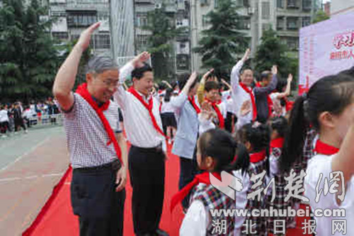 许万红一行来到襄阳市人民路小学,孩子们亲手为爷爷奶奶、叔叔阿姨们佩戴上鲜艳的红领巾,让大家重温少年时代的快乐时光,整个场景温馨和睦。市人民路小学正在举行“第二十届校园文化成果展暨庆祝‘六一’活动”,许万红一行观看了啦啦操、经典诵读等校园文化成果展示,参加了该校一年级新生集体入队仪式,并为新队员佩戴红领巾,赠送节日礼物。