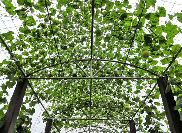 据小白讲,考虑到当地的高温天气,可能会对幼嫩的藤蔓造成影响,管理人员经过多方考量,搭设了竹制的攀爬架,这样既可以保证藤蔓爬得住,又不会因为温度过高灼伤幼苗。信步游走在这条瓜果飘香的长廊上,沐浴着从叶缝间投下的斜阳,十分惬意。
