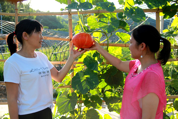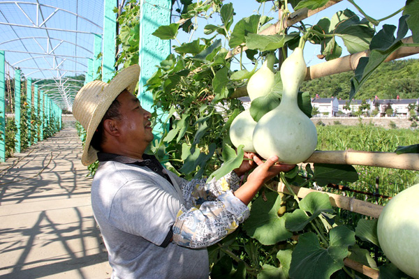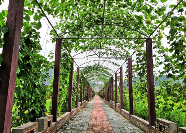 “这条长廊上有金瓜、葫芦、苦瓜、丝瓜四个品种,交互错开种植,确保光合作用。”管理人员白林和他的合伙人捧着一个硕大的葫芦为游人介绍。