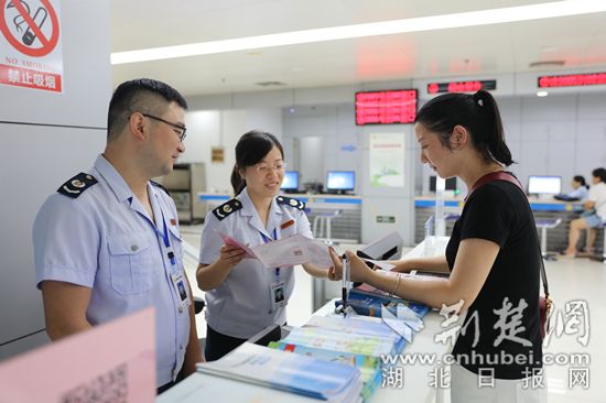 “您好,请问您要办理什么业务?”湖北盟科纸业有限公司财务主管卢韦一走进大厅,导税员聂媛马上迎上来,一边主动从他手上接过湿淋淋的雨伞放到门口伞桶内,一边热情询问。