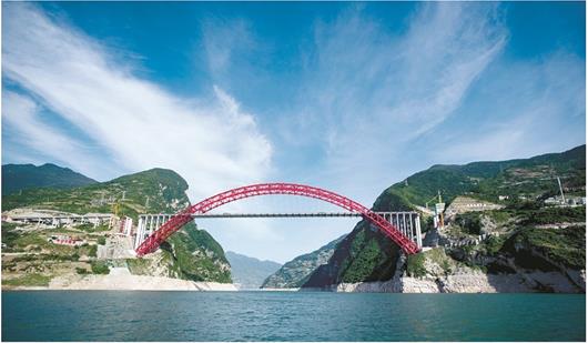 作为钢箱桁架推力拱桥,该桥跨度全球第一,净空高度亚洲第一。大桥在建设过程中,实现了四大技术创新:复杂地质条件下的边坡稳定与综合整治技术;大跨钢箱桁架拱的扣挂体系研究与施工技术;大型缆索吊机标准化研究与施工技术;大跨度钢箱桁架拱的安装与线形控制技术。
