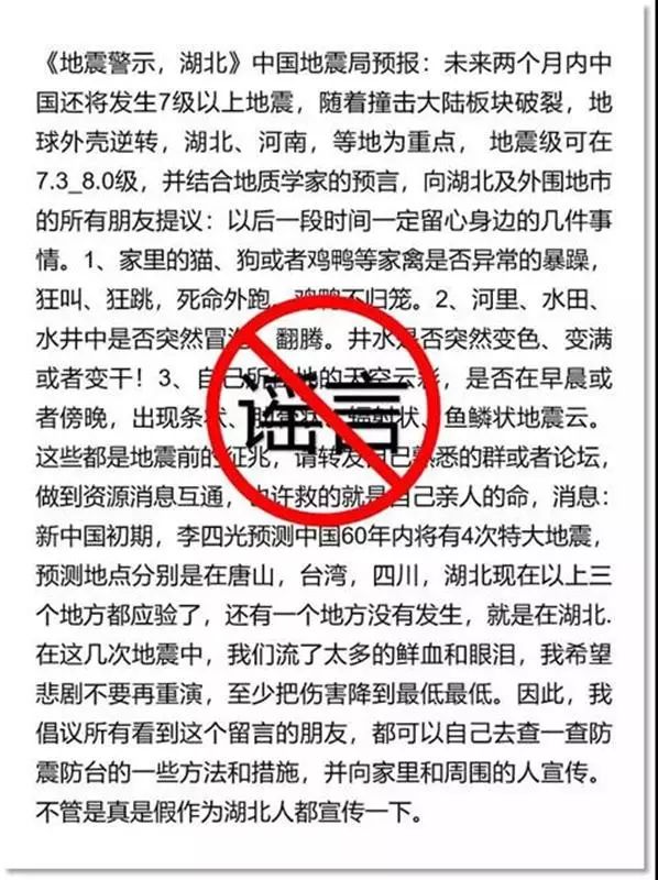 谣言中附上的精确震级,凡传说地震震级很大或震级很准确,发震时间、地点都很准确者基本都可判定为虚假消息。地震预测在全世界都是个难题,目前尚处于探索阶段。总的来说,能作出准确预测的地震还只占极少数。
