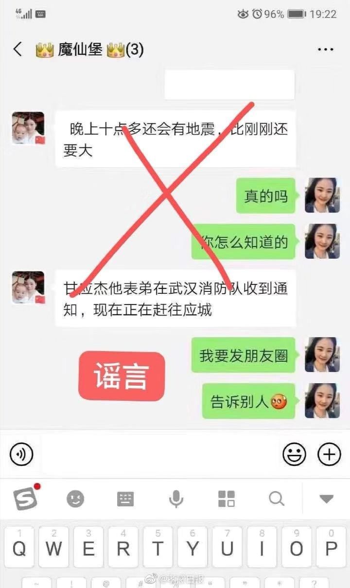 经审讯,李某供称,地震发生后,她在微信群中“吹牛”说“将发生更大余震”,为了让闺蜜陆某相信,她编造“老公甘某表弟在武汉消防队...”说法。